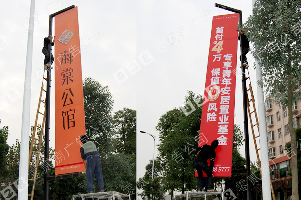 3、成都廣告戶(hù)外道旗畫(huà)面噴繪:這一種被房地產(chǎn)商應(yīng)用的很廣泛,它的尺寸可以由客戶(hù)自己定制。道旗一般正反面都要繃上畫(huà)面。常用于道路的兩旁作為宣傳。