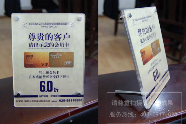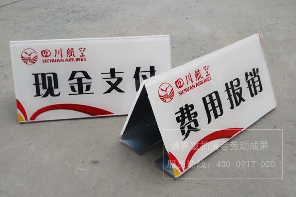 成都亞克力桌牌臺卡席卡制作 桌牌又稱臺簽,是指立在桌面上的標識牌,用于展示或提示甲方的信息。臺簽上的內(nèi)容可以是甲方的簡介,也可以是甲方提供的服務項目,如“服務臺”、菜單等。還可以指明甲方當前所處的狀態(tài),如“暫停售票”等。桌牌(臺簽)的尺寸: 臺簽一般都比較小,寬度一般都在25公分以內(nèi),有橫版的和豎版的,下方有底座或有支撐架,以保證臺簽能直立。