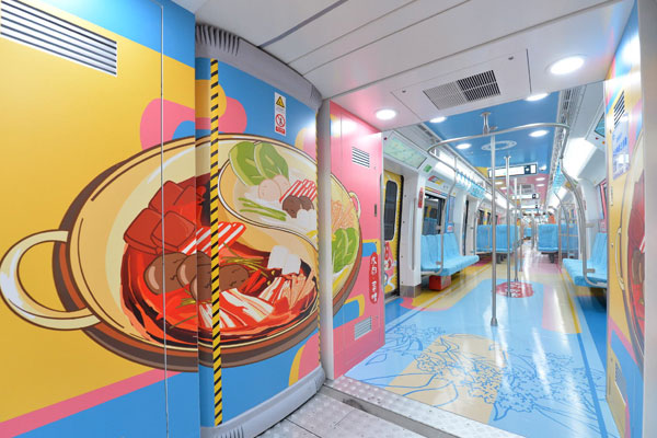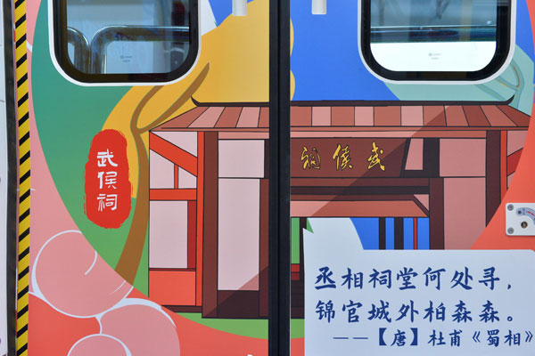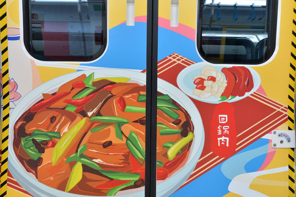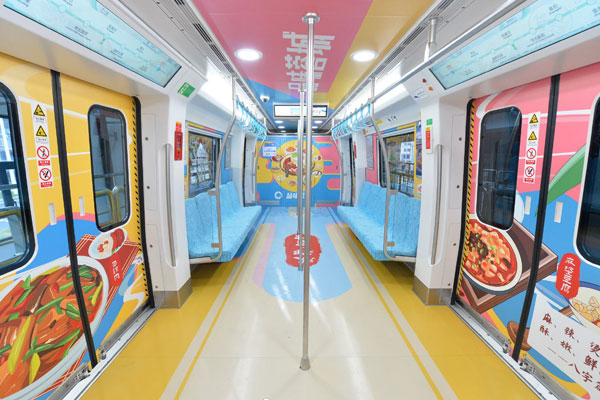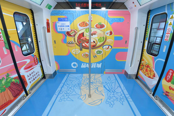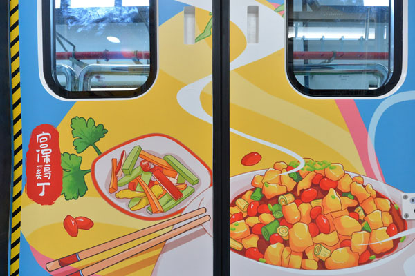來啦!城市文化主題,將8節(jié)車廂劃分成蜀址、蜀遺、蜀樂、蜀味4大板塊,成都軌道交通17號(hào)線主題列車旨在展示成都悠久的城市歷史和多彩的民俗文化?;疱仭⒒劐伻?、麻婆豆腐宮保雞丁…感覺會(huì)越坐越餓