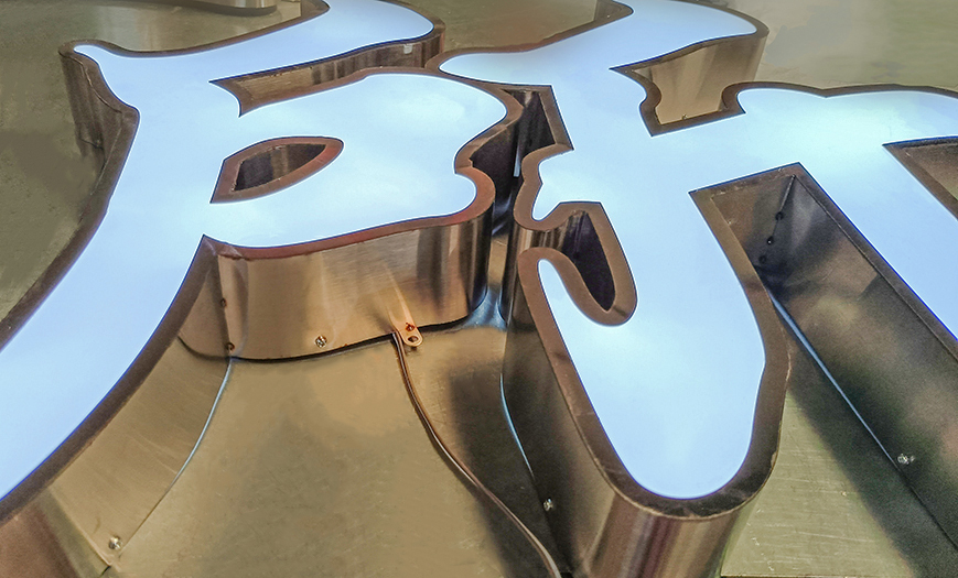 不銹鋼字是以不銹鋼為材料,通過切割、打磨、包邊、拋光等工序制作而成的不銹鋼廣告字。